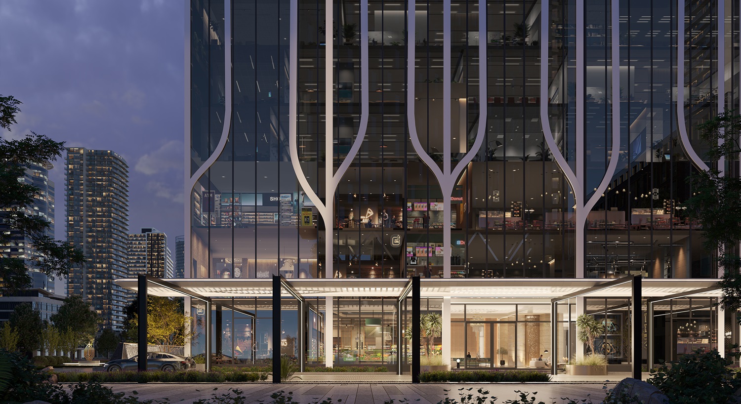 Retail units & kiosks at base levels.